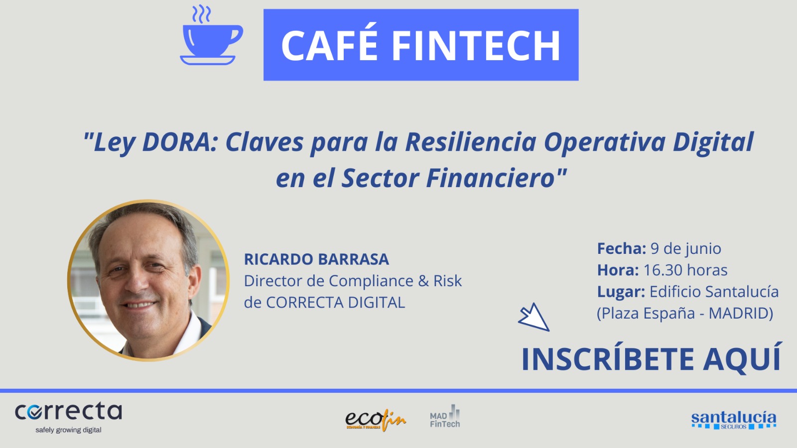 A través de ejemplos reales, consejos con buenas prácticas y explicaciones sobre las mejores estrategias para implementar DORA en las empresas, el evento del 9 de junio, que tendrá como sede las oficinas de Santalucía en Madrid (Plaza de España) y se emitirá online en directo, contará con la participación de Ricardo Barrasa, director de Compliance & Risk de Correcta Digital.