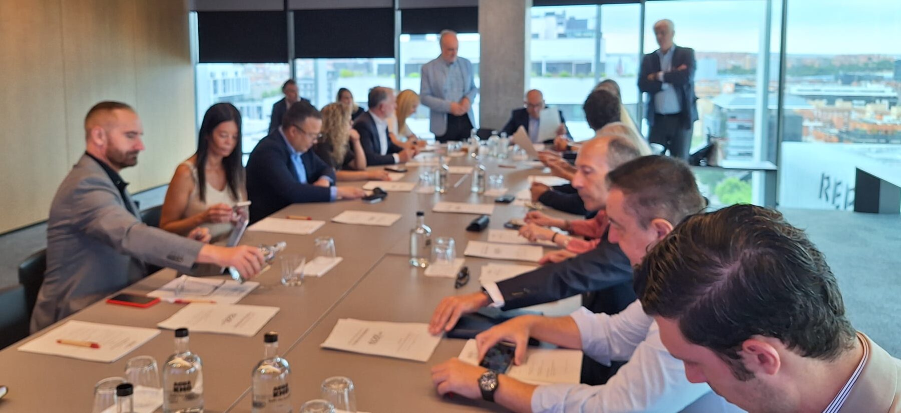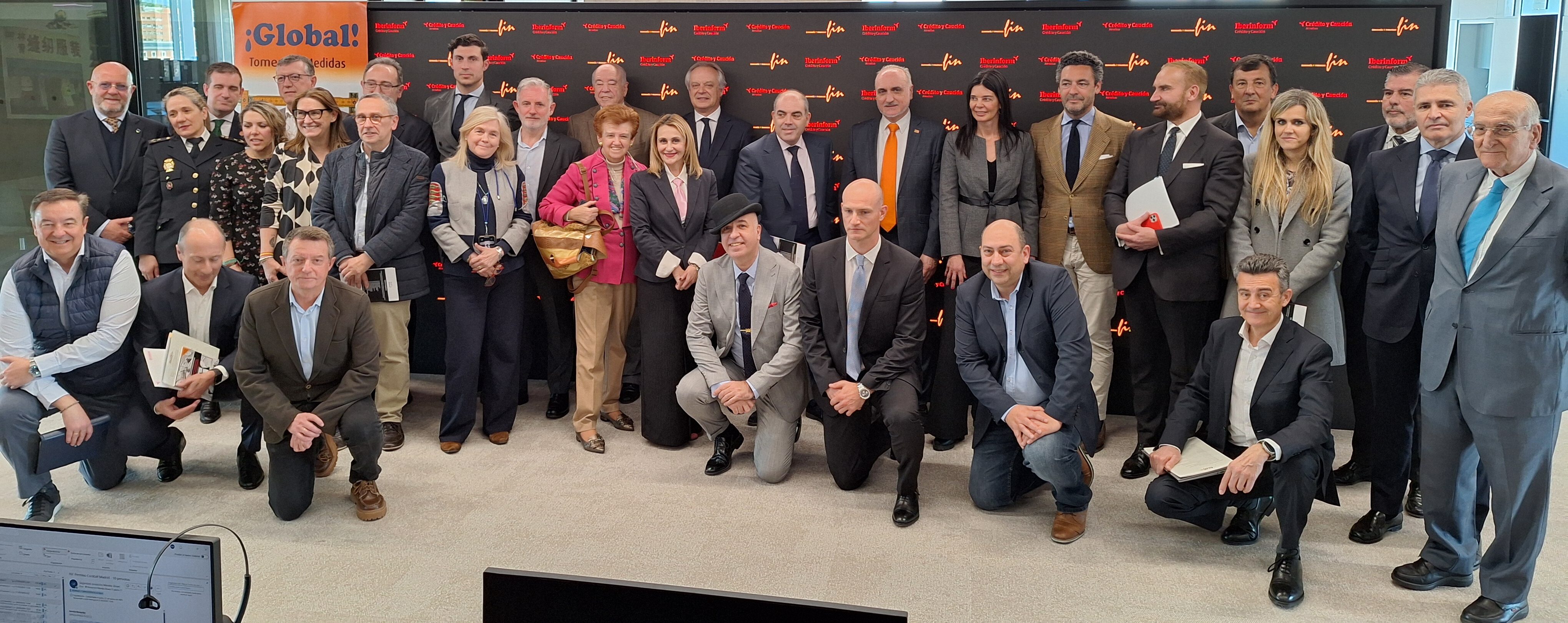 En la fila delantera, agachados, Antonio García Lozano, consejero de Nervo Group / Insurama; Fernando Losada, director de Desarrollo de Negocios en PIB Group; Norberto Ruiz, teniente coronel en el Cuartel General del Ejército de Tierra; Luis Livingstone, cantante, compositor, casco azul y empresario; Arnaud Gravenstein, director de operaciones de Duma Engineering Group; Marlon Molina, director del CyberLab FinTech y director de Computerworld University; y Juan Saborido, director comercial y de Marketing de Iberinform.