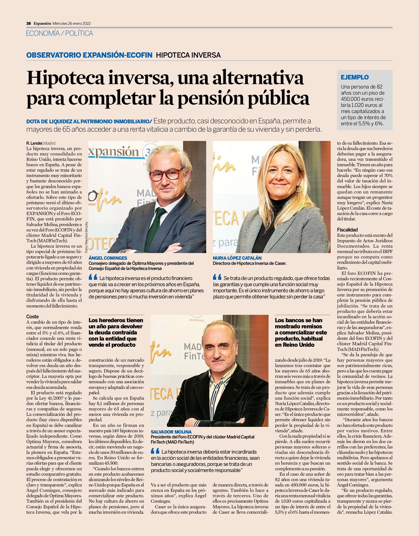Ahora, el diario Expansión recoge en sus páginas este Observatorio, que sirvió para presentar al gran público un producto financiero poco conocido en España, a pesar de contar con más de 9 millones de personas mayores de 65 años, de las cuales casi nueve de cada diez poseen una vivienda en propiedad. Todo ello, en un contexto de dificultad para sostener a largo plazo el sistema público de pensiones.