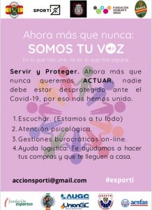 Fundación Woman’s Week colaborará con otras entidades a través de la plataforma #esporti, en la que participa junto a RAGCE y AJPNE. Juntos, crearán una red de voluntariado para ayudar a personas con necesidades especiales durante el confinamiento en que se encuentra España.