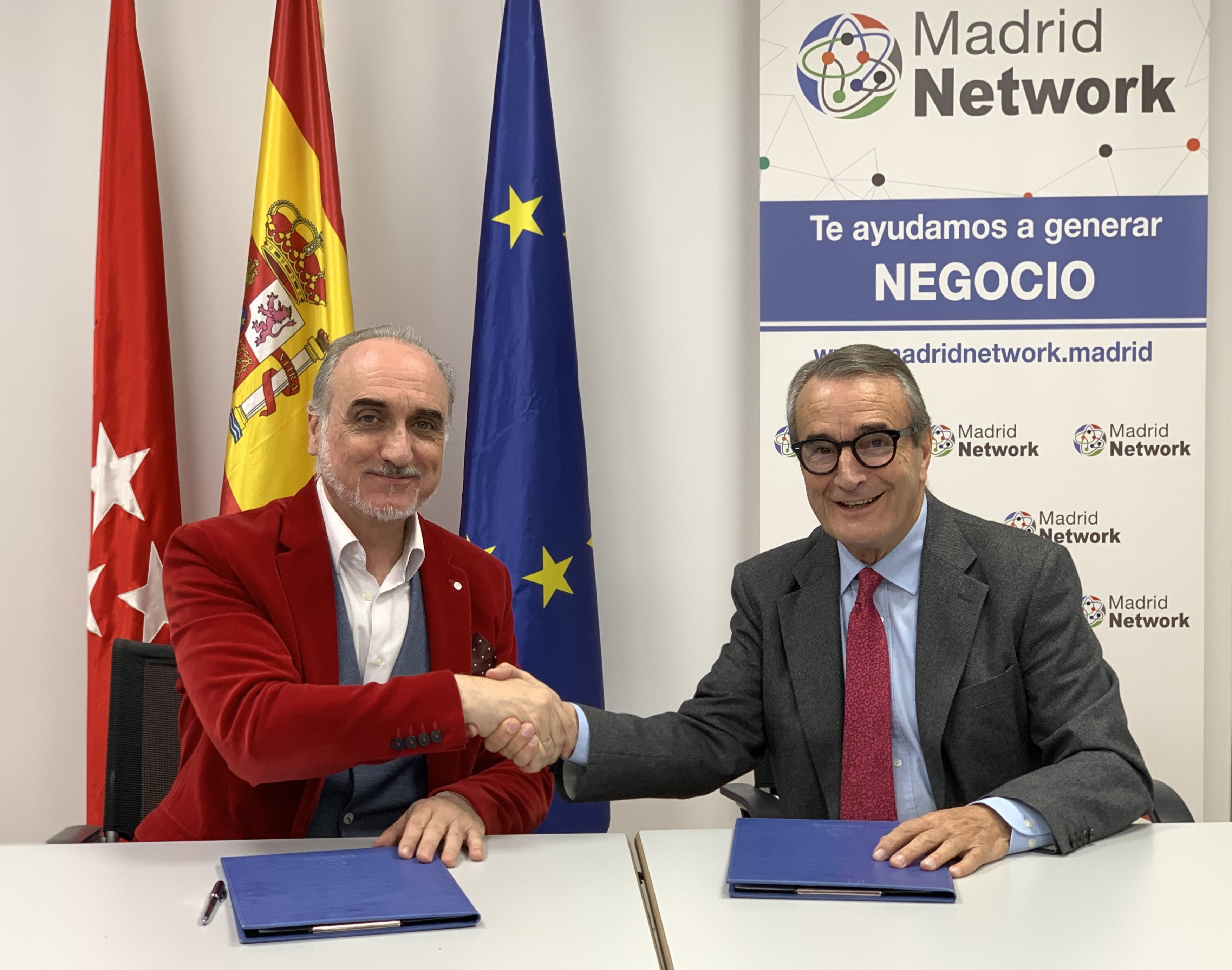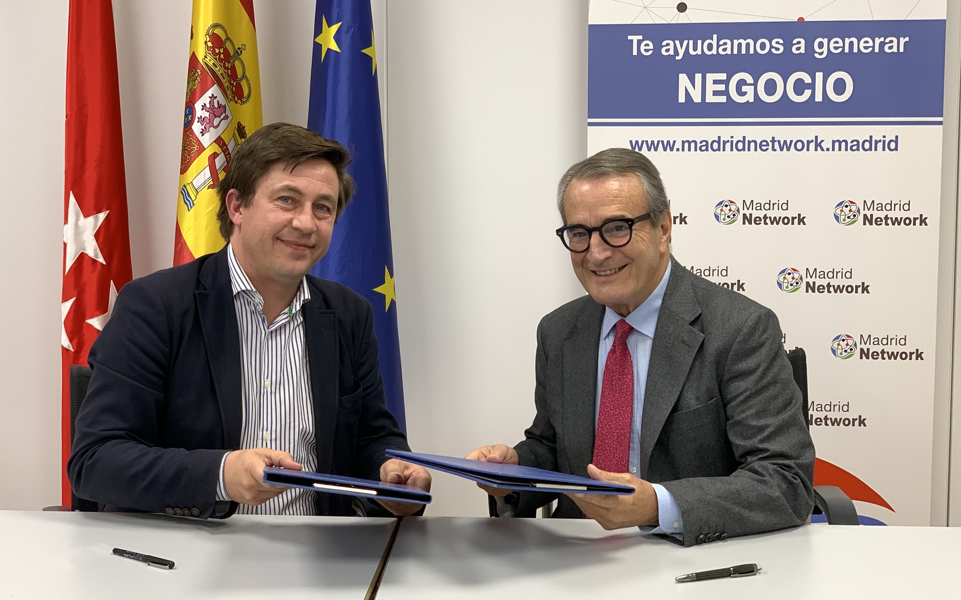 Salvador Molina firma el convenio en nombre del clúster MAD FinTech con Rogelio Pardo, presidente de Madrid Network.