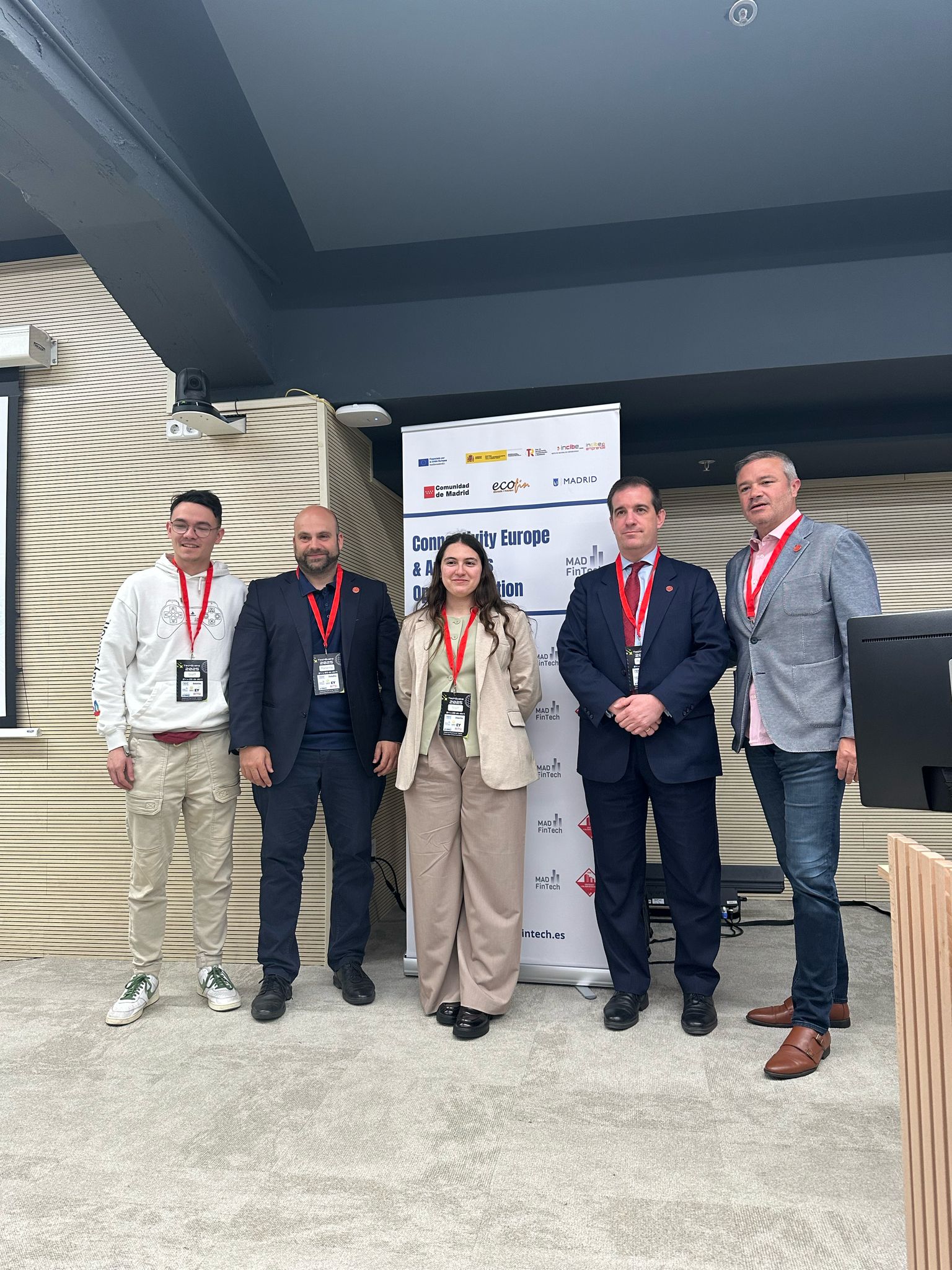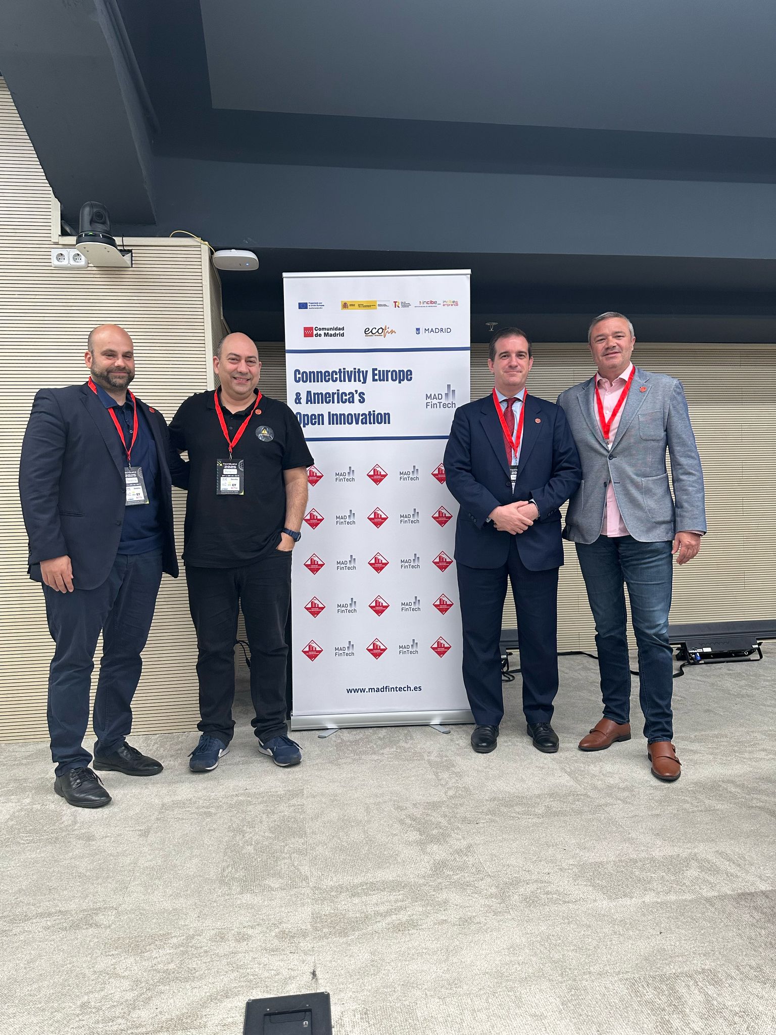 Marlon Molina y Fernando Mairata ponen marco al cartel de MAD FinTech e INCIBE, que fueron patrocinadores del congreso anual de RITSI. Junto a ellos, otros dos expertos de DLTCode: Javier Soria y Santiago Barrio.