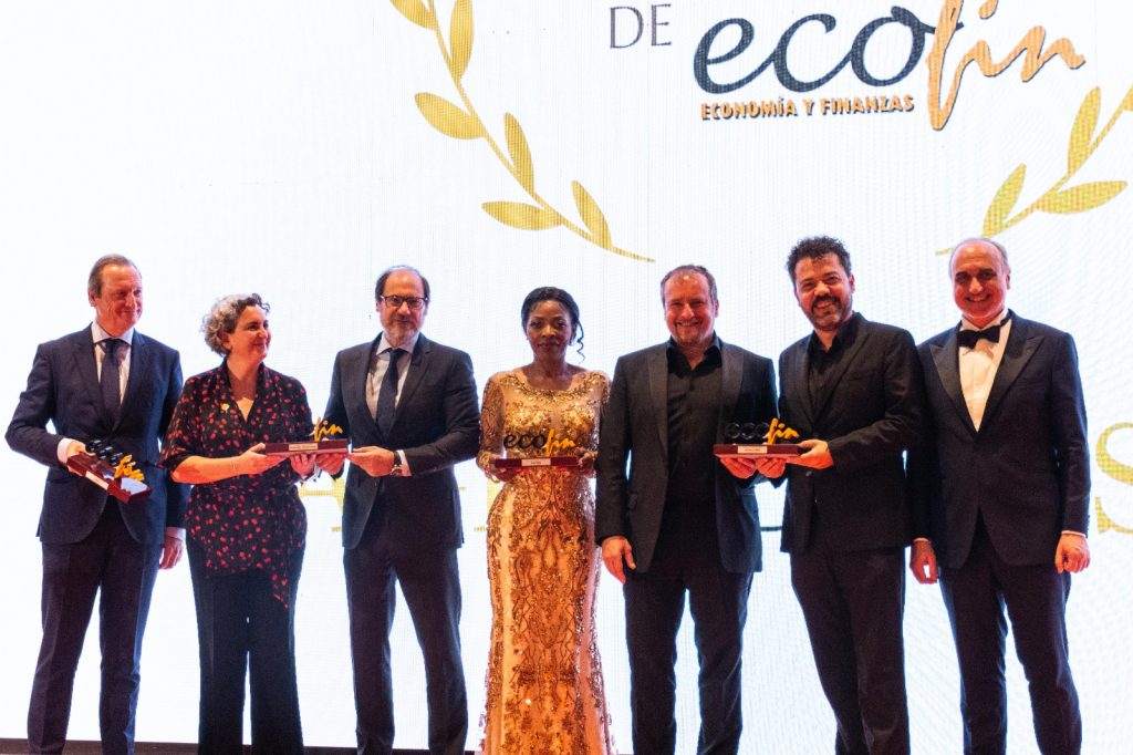Entrega de los Premios ECOFIN Imagen de España. De izquierda a derecha, Fernando Terry (Grupo Osborne), Pepa Muñoz (World Central Kitchen), Mariano González (Comunidad de Madrid), María Cristina Mikúe (Punta Europa), el actor Fernando Cayo (el coronel) y Jesús Colmenar (La Casa de Papel y Vancouver Media) y Salvador Molina. / Imagen: Andrea Leontina /EFTI