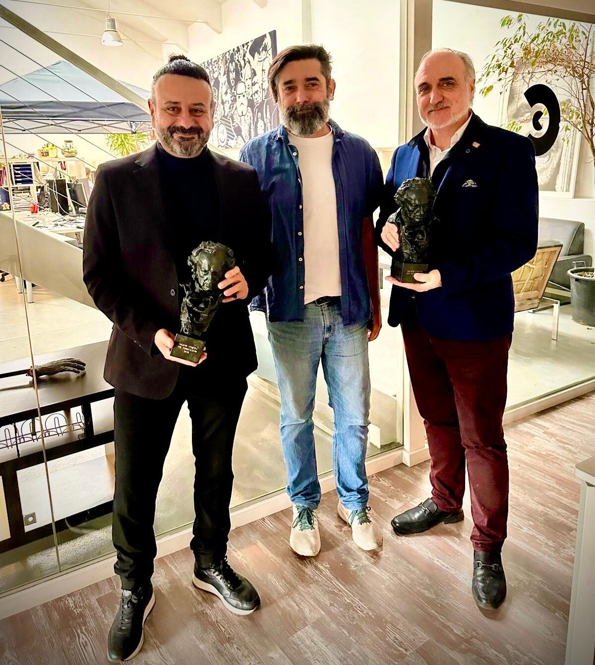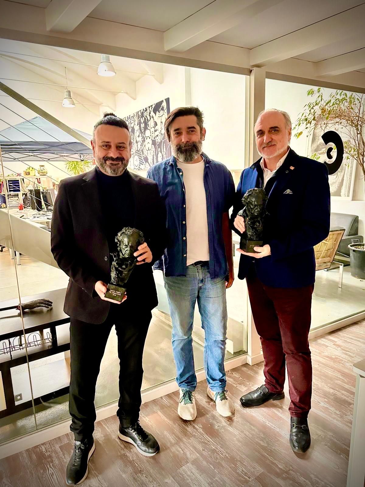 Antonio Torres y Salvador Molina rodean a Carlos Fernández de Vigo, el gallego afincado en Pamplona, experto en IA y Animación, posan junto a las estatuillas del Goya recibido por Cafuné, el corto de animación premiado en los Premios Goya 2025.