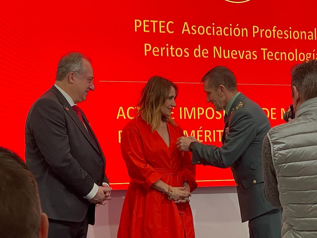 En la edición del pasado año, Carmen M. García recibió esta medalla al mérito de la Ciberdefensa por la creación de SOS en Red y de C1b3rWoman, como herramientas de defensa contra la ciberdelincuencia entre los colectivos más vulnerables de mujeres, jóvenes, mayores, etc. El comandante José Luis González, director de la Ciberliga de la Guardia Civil, le impuso la medalla en presencia de Ignacio Carrasco, presidente del Comité de Grados de PETEC.