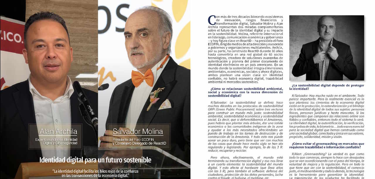 Este mes, la revista Factor de Éxito ha llevado a sus páginas a Salvador Molina, presidente de Foro ECOFIN y MAD FinTech, y consejero delegado de ReactID, y a Alan Archila, fundador y CEO de esta compañía especializada en identificación digital segura. De hecho, es de identidad digital de lo que hablan ambos directivos en la entrevista, donde también se centran en la sostenibilidad como eje para hacer negocios responsables y, aunque sea redundante, sostenibles… en el tiempo.