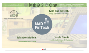 El presidente del clúster también aprovechó su participación en el programa para hacer un repaso a las últimas normativas del sector, especialmente la legislación sobre el Sandbox. Algo que los oyentes de MásQueUnaRadio pudieron conocer más de cerca porque también participó en el programa Úrsula García, socia de FinReg 360 y presidenta del Grupo de Trabajo del Sandbox Español del clúster MAD FinTech.