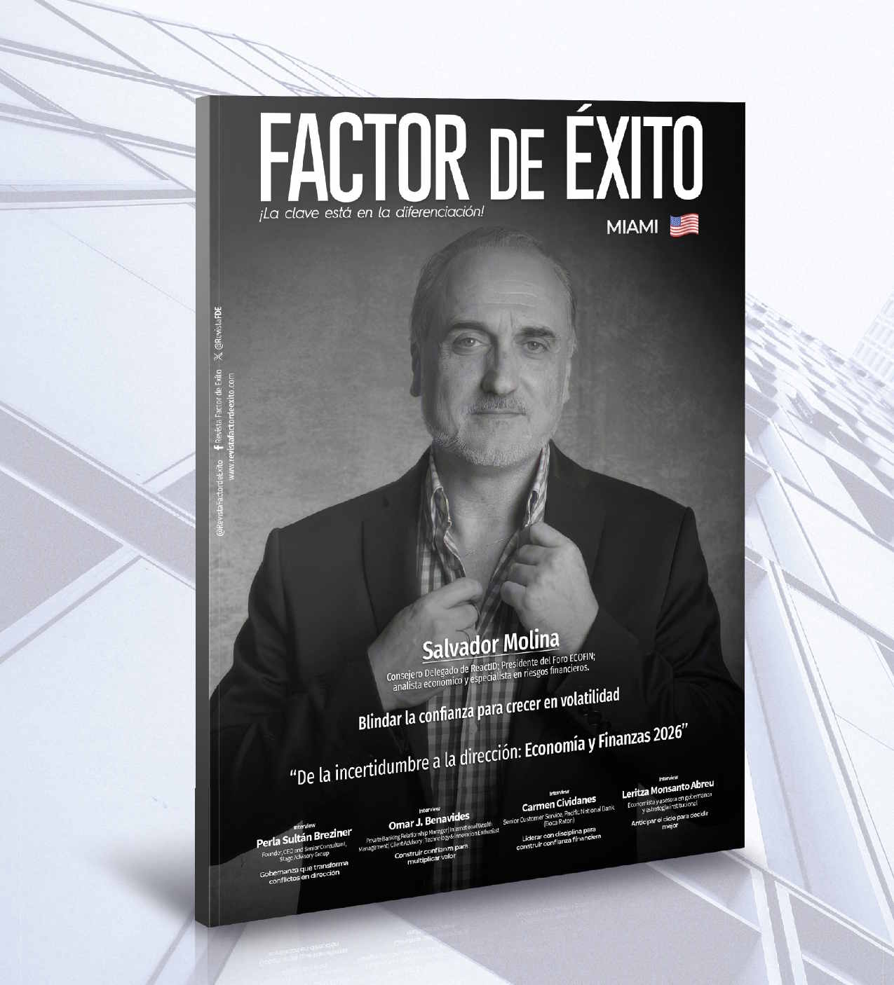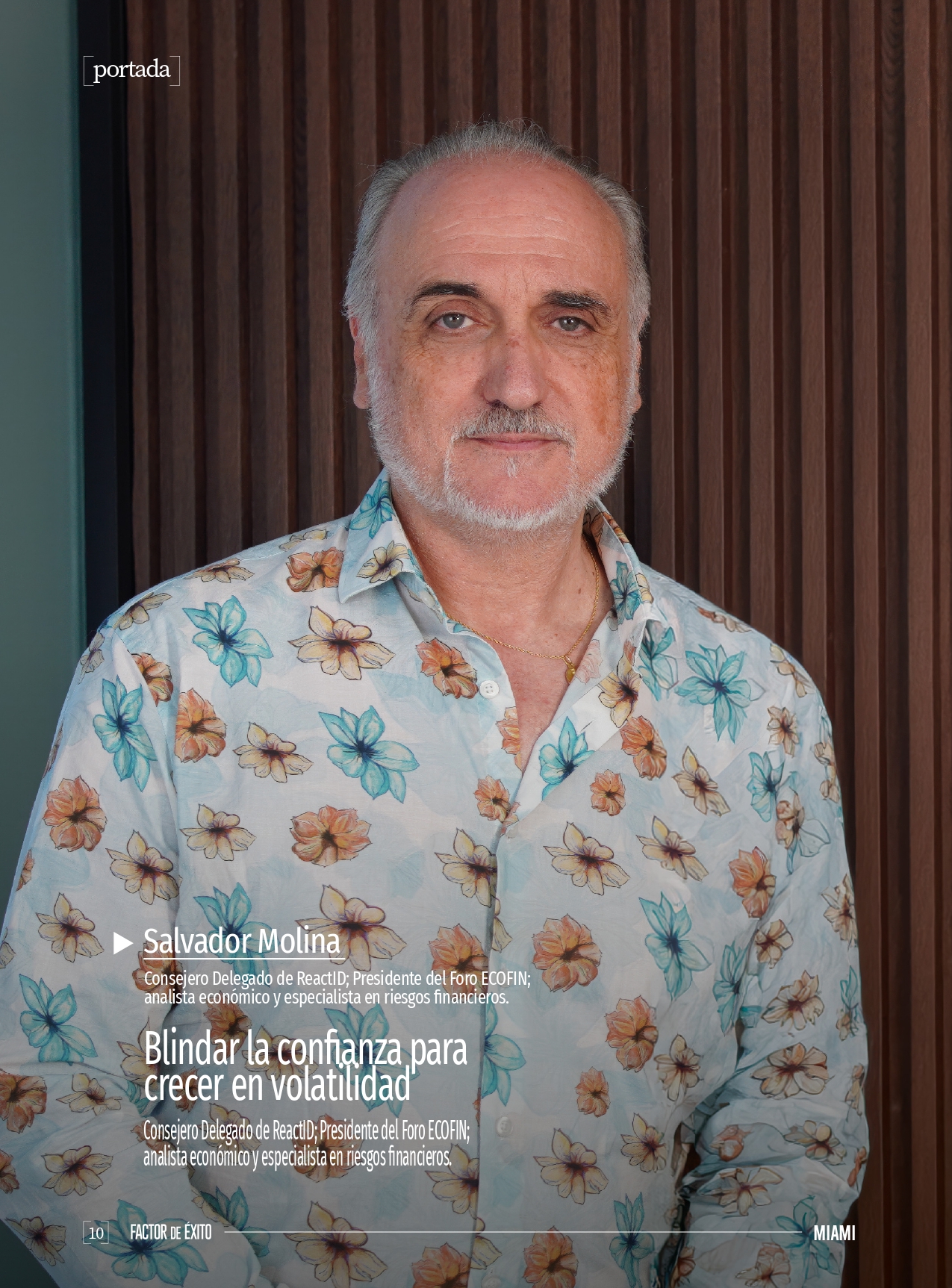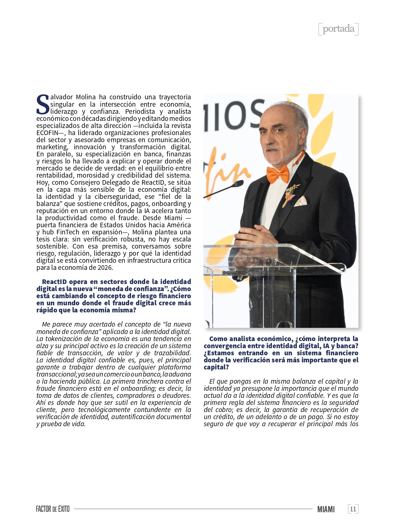 Salvador Molina, presidente de Foro ECOFIN y del clúster MAD FinTech, y consejero delegado de ReactID, protagoniza la portada de la edición de Estados Unidos del último número de la revista Factor de Éxito, una publicación líder en contenidos empresariales en el continente americano.