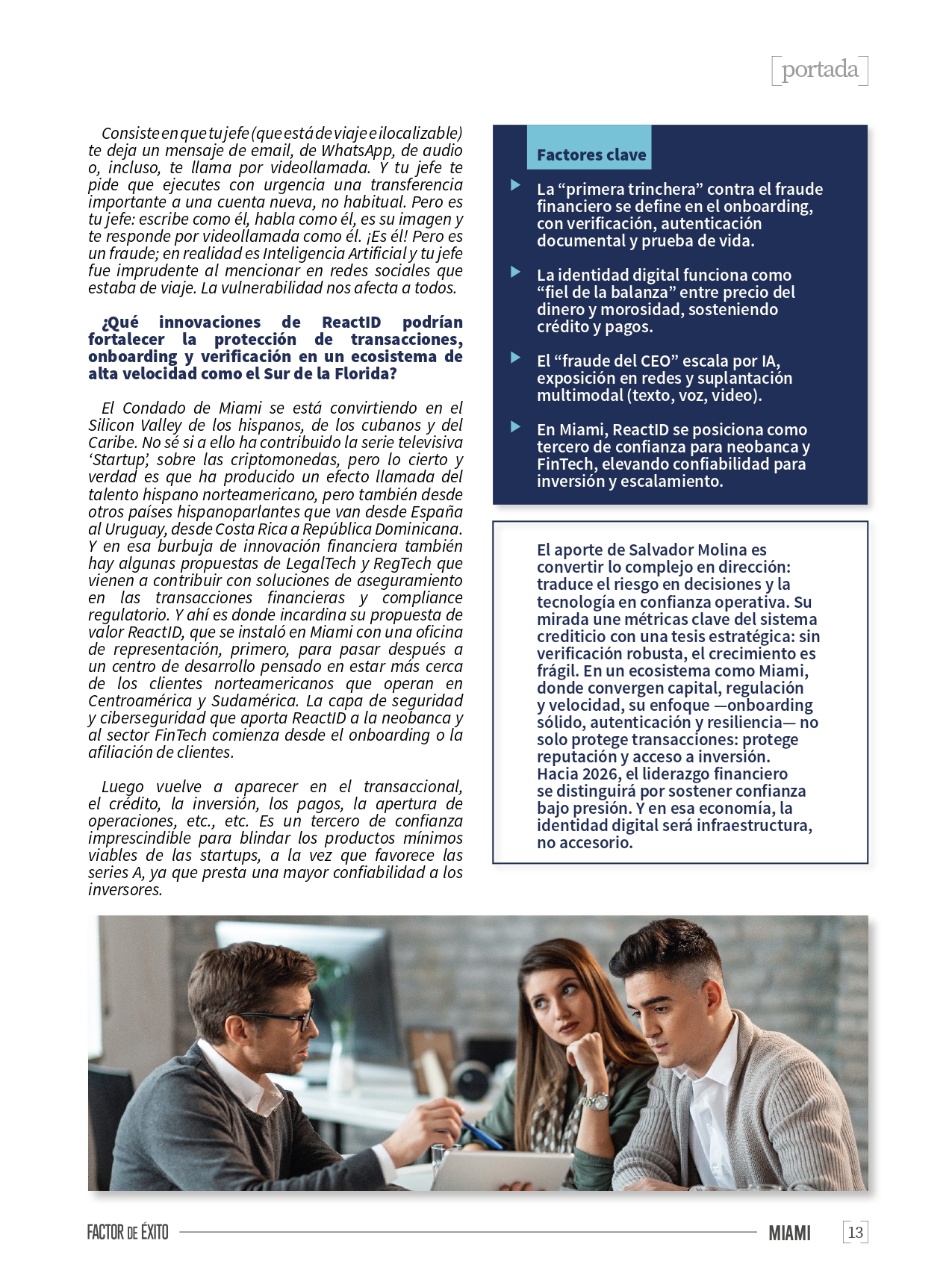 En sus páginas interiores, la revista dedica una extensa entrevista a Salvador Molina, quien habla de temas como la incertidumbre empresarial derivada de los acontecimientos globales, la convergencia entre identidad digital y el sector financiero en la era de la inteligencia artificial o el papel de ReactID en el futuro de las empresas a través de la seguridad que ofrece a la relación entre compañías y clientes.