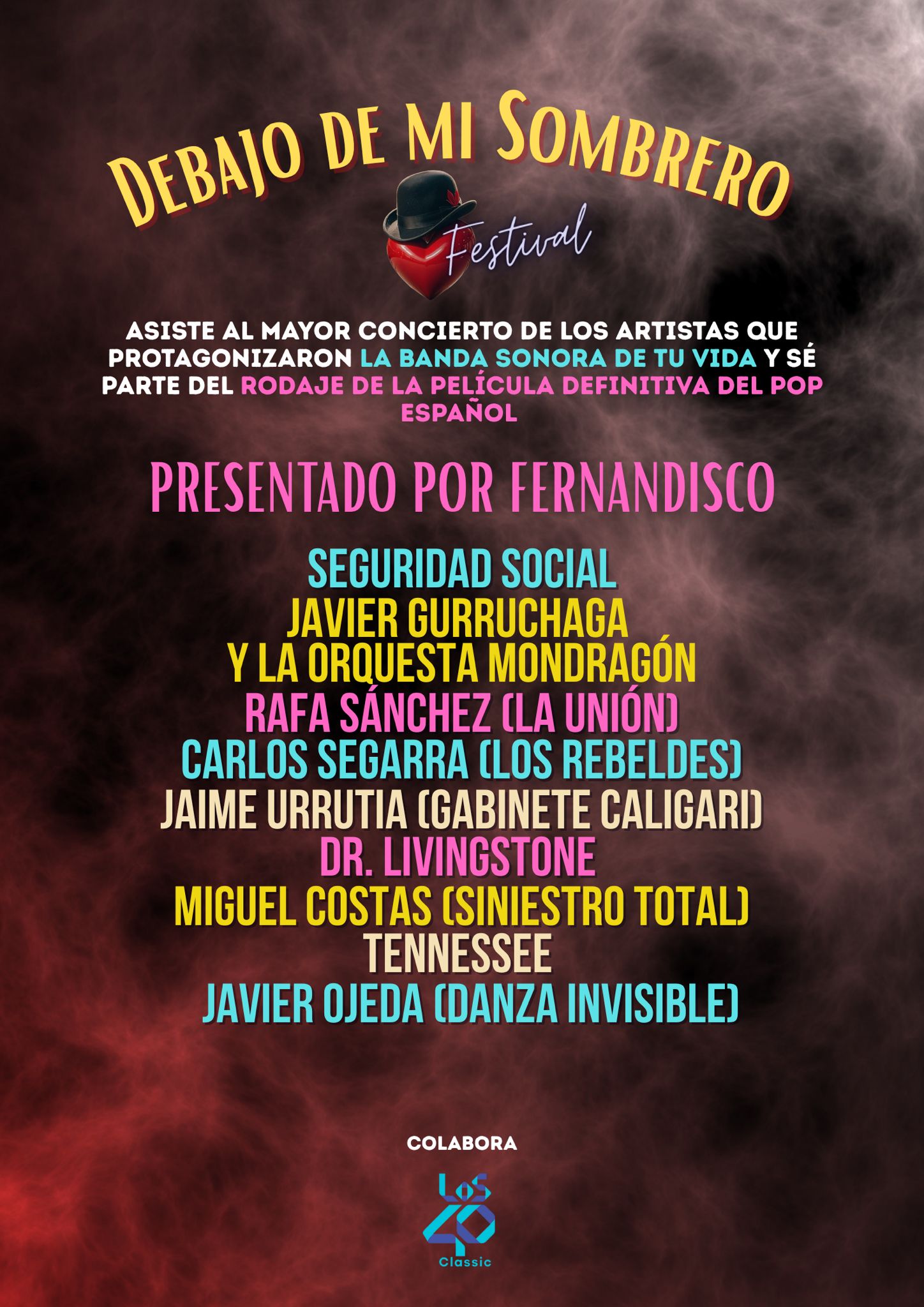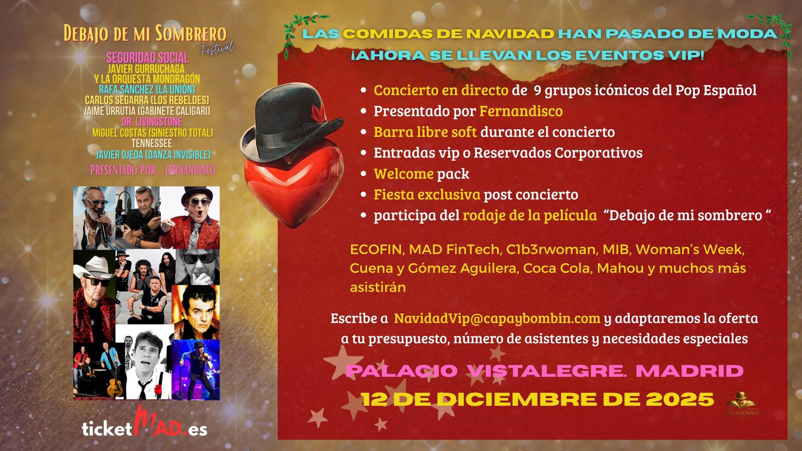 ¡Todo preparado para El Mayor Espectáculo de estas Navidades! ¿Preparados para la nostalgia? Madrid acoge el 12 del 12 el Festival Debajo de mi Sombrero, donde el mítico Fernandisco presentará una gala que reunirá a Seguridad Social, Javier Gurruchaga y la Orquesta Mondragón, Rafa Sánchez (La Unión), Carlos Segarra (Los Rebeldes), Jaime Urrutia (Gabinete Caligari), Livingstone, Miguel Costas (Siniestro Total), Javier Ojeda (Danza Invisible) o Tenesse. Con Los 40 Classic como emisora oficial.